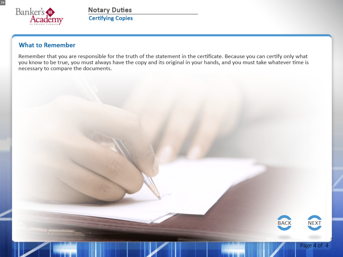 This course will introduce the learner to the various duties and objectives of bank notaries. The learner will become acquainted with the process and procedures surrounding identity verification, oaths, and more. After completing this program, the learner will be able to: